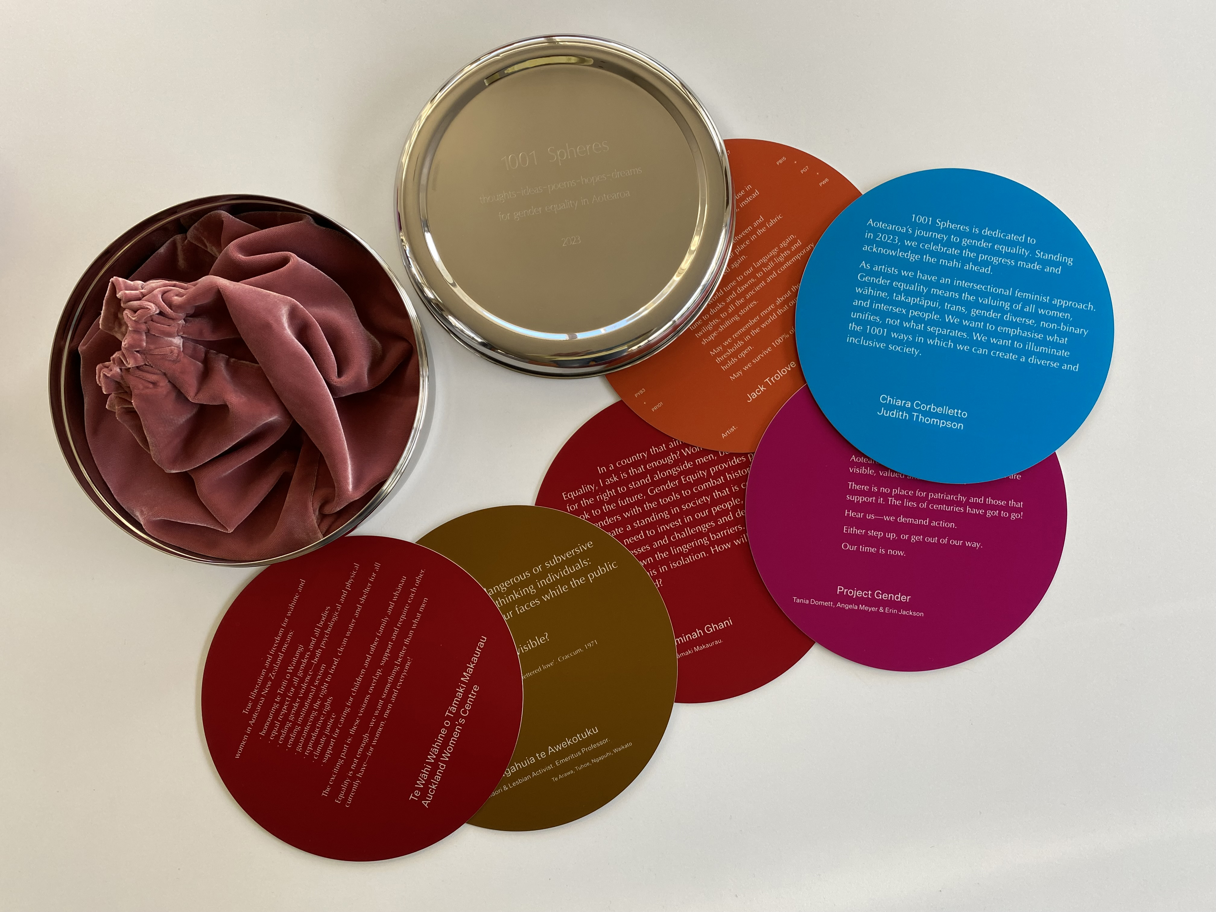 These written-word contributions are concealed invisibly within the sculpture. Each text is beautifully designed by typographer Catherine Griffiths and individually printed on vibrant anodized aluminium discs. During the final stage of fabrication, the 23 discs were placed in a round stainless steel container and secured inside 1001 Spheres, empowering the sculpture with human spirit and intent.