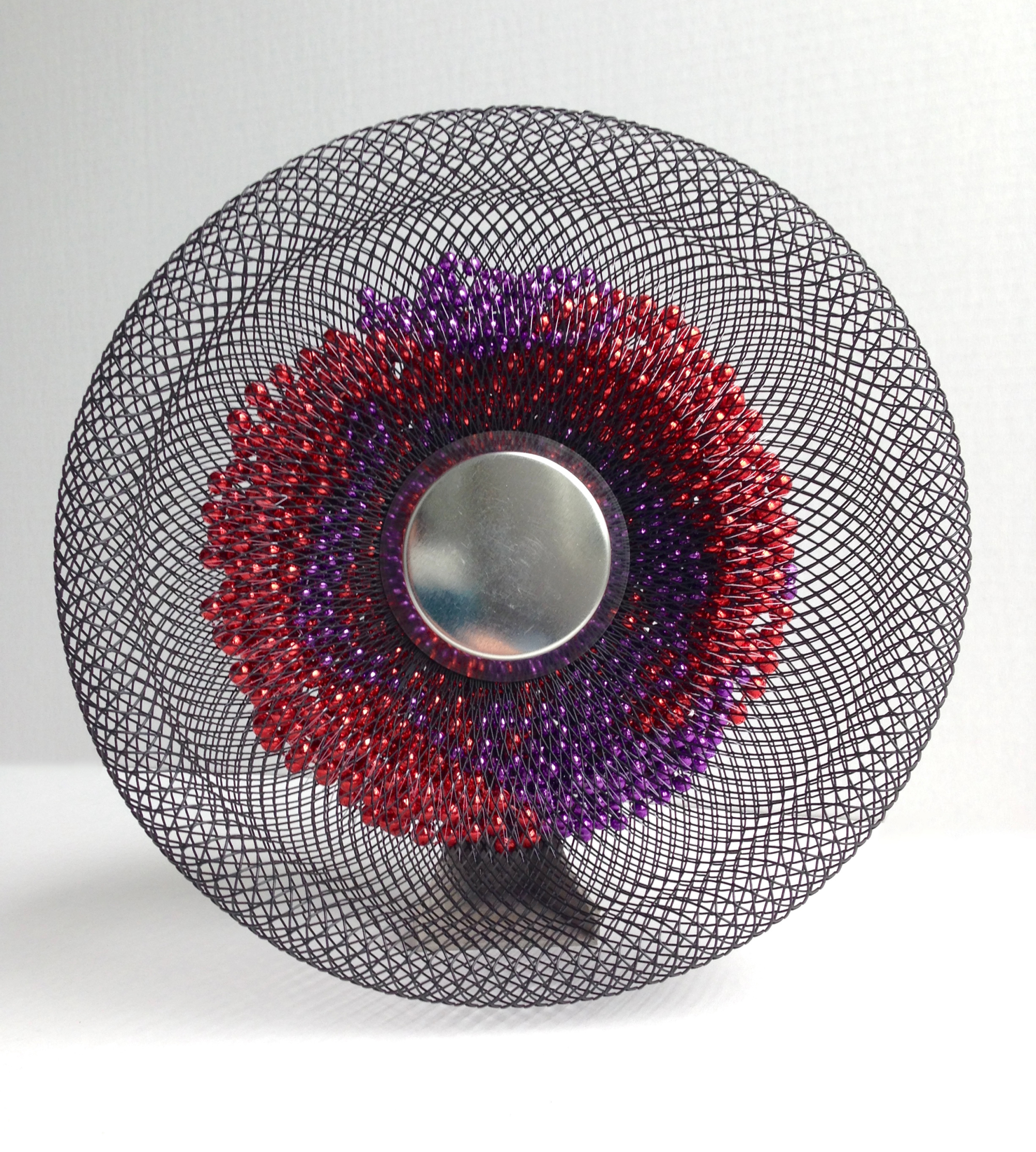 Held within the double layer of the wire hemisphere is a vibrant corona of stainless-steel spheres in a mix of mirror finish, magenta, vermillion and orange. The number of spheres forming the corona is actually 1300, rather than being an exact count, the title 1001 Spheres suggests an infinite or uncountable number.